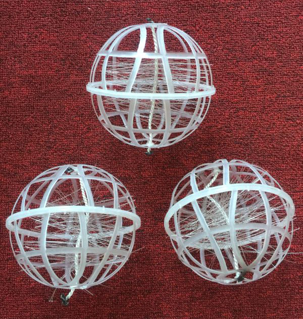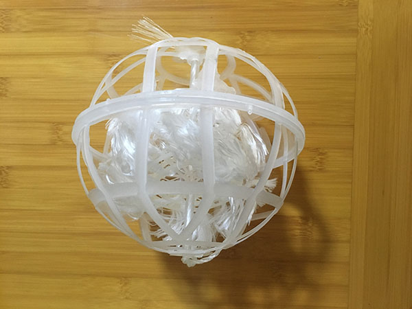 彈性絲條在球體骨架內(nèi)呈主體均勻排列幅射狀態(tài),使氣、水、生物膜得到充分混摻接觸交換,生物膜不僅能均勻地生 長在每一根絲條上,保持良好的活性和空隙可變性,而且在運(yùn)行過程中球體與球體間在氣體的作用下形成自由相互碰撞, 并有良好的新陳代謝和不會結(jié)成團(tuán),系統(tǒng)切割能力強(qiáng),空間體積利用率大,無死區(qū)等特點(diǎn),處理效果好,是生化法處理污 水比較理想的新型懸浮填料。